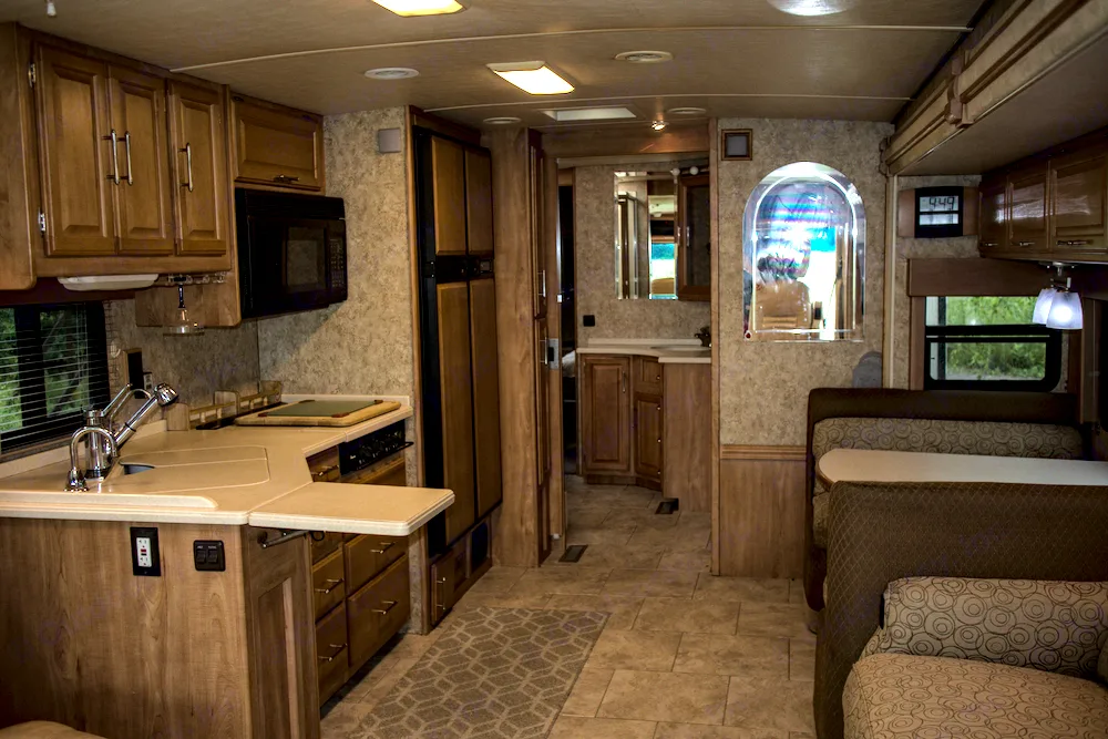 In the front of the RV is the living area complete with dinette, sleeper-sofa, chairs, TV, stereo, board games, and a fully stocked kitchen.