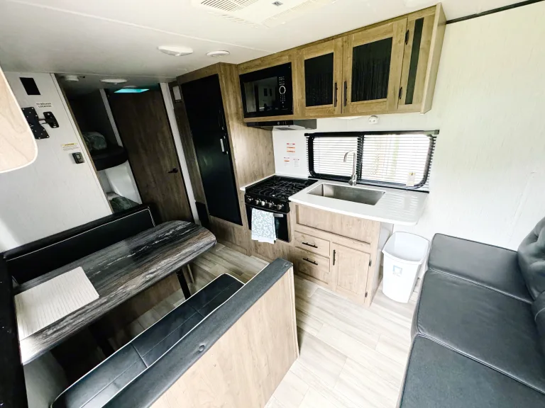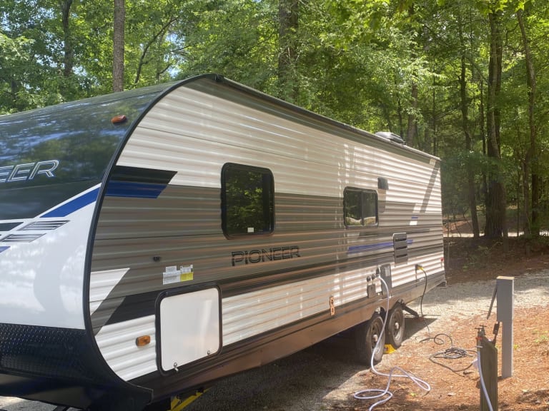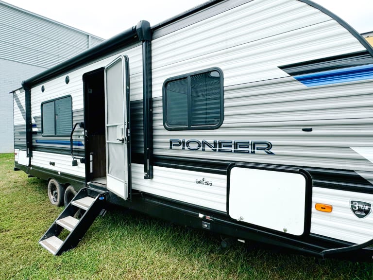 Hey everybody! I hope to provide a great camping experience with my 2022 Pioneer! My Pioneer includes a master bedroom with a queen bed, two bunk beds, a pullout couch, and a dinette table. I have a tv in the master bedroom that can be taken off the mount and used anywhere around the camper. I include plenty of towels and sheets, as well as a toaster and a coffee maker. I also include four outside chairs, an outdoor rug, and cornhole boards. Happy Camping!