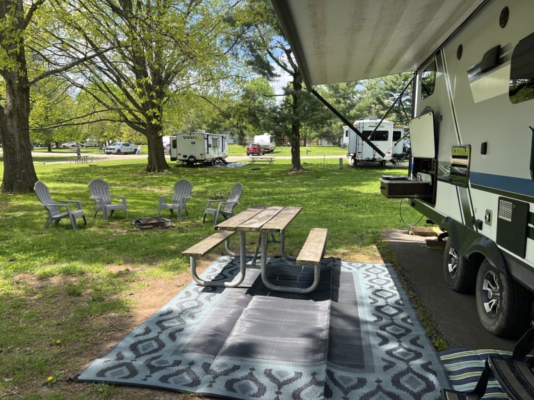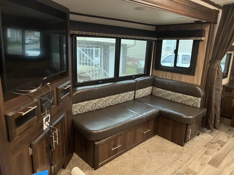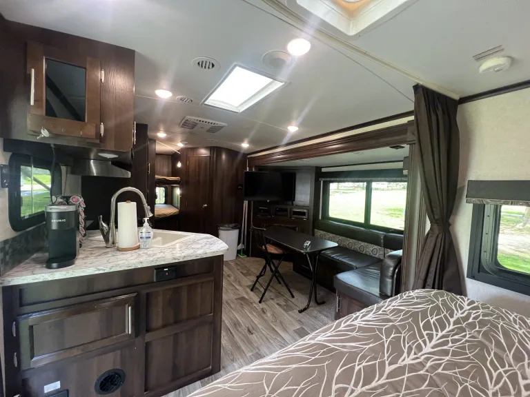 This like new camper is smoke free and pet free. It is insulated for winter living. It comes stocked with the kitchen essentials. It has electronic levelers and jack, a nice memory foam full size mattress, two oversized bunk beds, and a large corner shower. It has an outdoor kitchen and grill, an outdor shower and speakers. The TV can also be mounted under the awning. It has a satellite, TV and bluetooth stereo system and comes with everything needed to hook up and have a great time. Windows are tented and there is a privacy curtain for the bunk beds and for the full size murphy bed that folds down over a sofa. The kitchen table can be made into a bed as well.Ce qui est inclusdishes, RV toilet paper, cleaning supplies, waste tank supplies, hitch with sway barRecommandationsfull size sheets, towels and wash cloths, full size sheets for bunk bedsAutres points à signalerno pets or smoking. We do not set up and level if we deliver.