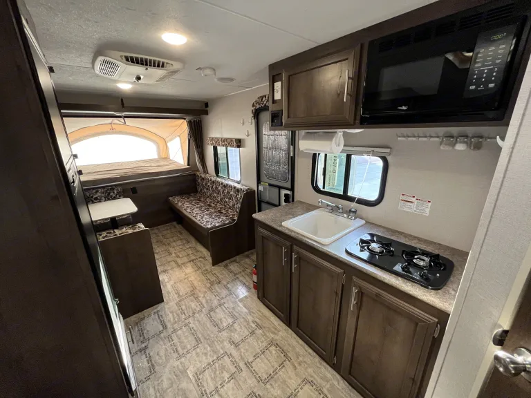 Tent camping or RV camping? Why not both! This trailer has three full size pop out canvas tent beds while still enjoying the luxuries of a traditional RV with a full kitchen(stove, refrigerator and freezer, sink, and microwave), bathroom with toilet and shower, four person dinette that converts to a bed, and couch. It has a Bluetooth stereo with inside and outside speakers and easy to operate push button electric awning. Equipped with a roof mounted A/C for those hot days along with a 20,000 BTU furnace for any cold nights. The trailer comes fully furnished to include bedding, kitchenware, pots/pans, towels, and some appliances. It only weighs 3,200 lbs which makes it towable with most SUV’s and pickups. This is a perfect family trailer to enjoy the beautiful Black Hills.Ce qui est inclusFresh linens, pillows, towels, kitchen utensils, pots and pans, silverware, plates, cups, bowls, coffee maker, camping chairs. Delivery and set up available up to 40 miles for an additional fee. Portable generator also available if needed for an additional fee. Autres points à signalerDelivery include setup/takedown