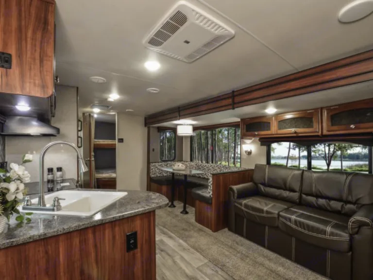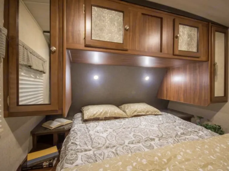 Brand new. Sleeps 6 adults comfortably. If they are children, can sleep more. Queen bed, double bunk beds, and pull out couch. Also table turns to sleeping area. Dual ac and heat Microwave, gas stove and oven, dual peopane tanks, flat screen TV, tv cable ready hookup, Bluetooth, and indor outdoor speakers, outdoor fridge, awning with LED lights, shower/tub, slide out, central vaccuum. Full kitchen with double sided sink. Furnished with utensils, dishes, ect. Electric stabalizers. Beautiful, comfortable, and smoke free. Only 6416 lbs, so is easy to tow. Fridge and freezer. Pull out outdoor grill.