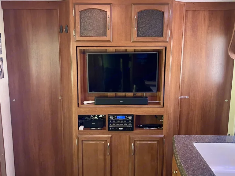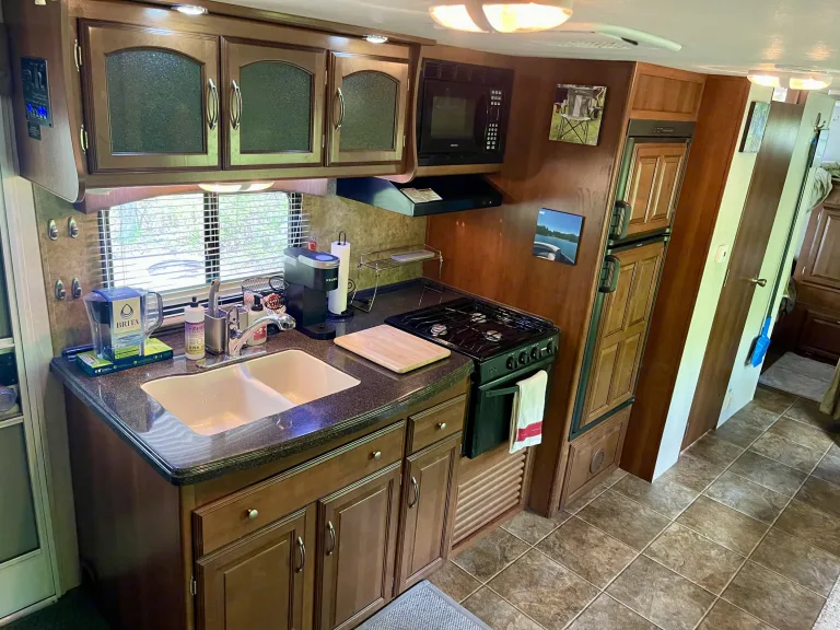 Custom trailer with custom full-size queen master bed with full (home) mattress. The bunkhouse sleeps 4 with room for more in the kitchen/living area. The common area has a large open feel due to the large bump-out. Everyone comments on the skylight over the dining area. A very spacious floor plan for the size of the trailer. The table and sofa fold down into beds. You could put two kids on each of those beds and sleep 10 in this camper. Ce qui est inclus• Britta filtered pitcher