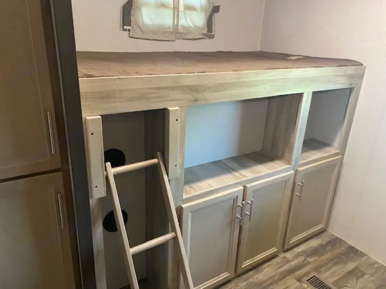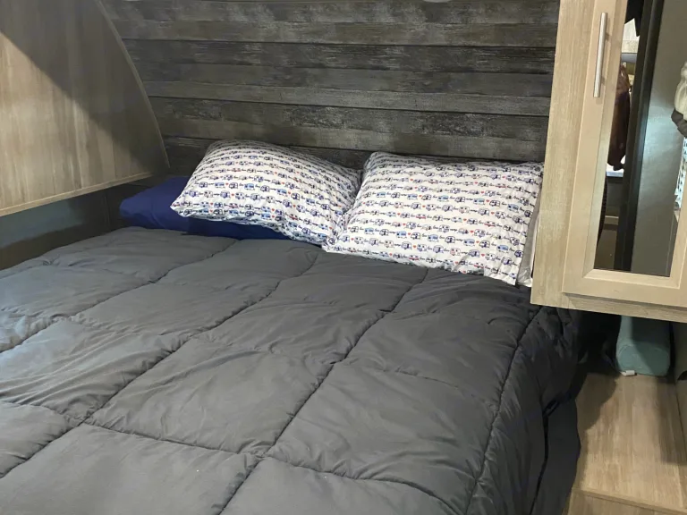This RV is able to sleep 7 comfortably. The main bedroom has a queen bed with usb plugs for devices. Plenty of room to hang clothes and upper cabinets for additional items. The rear bunk house has 3 beds. The bottom mattress can be used as a sofa, twin or fold it out for king size! There is are 2 additional beds are twin size.