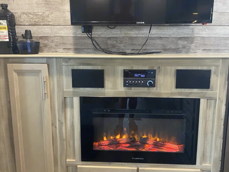 In the kitchen you have a stove, oven, toaster, fridge/freezer and farm house sink! The sofa folds out to a bed as well as the dining table converts to more sleeping room. The fireplace can be used as decorative or heat.