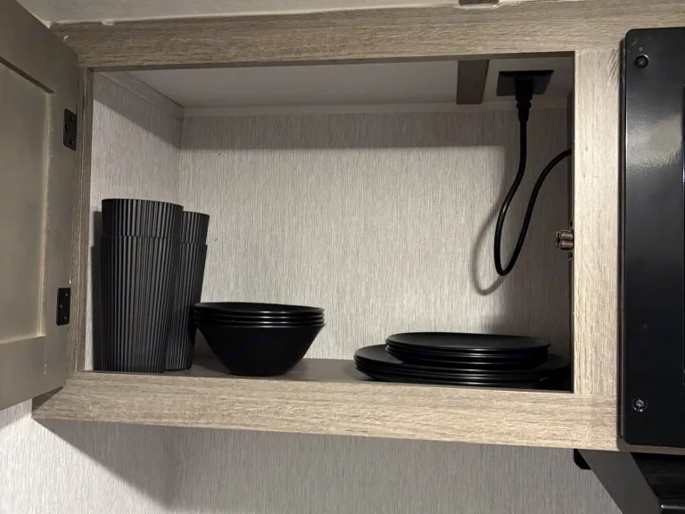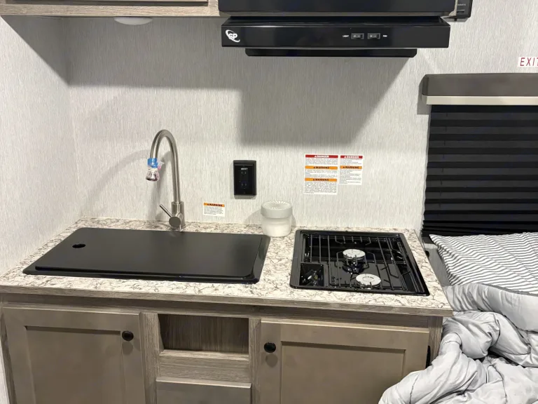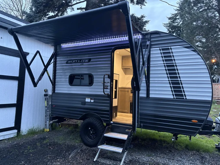 • Relax under the power awning with LED lights; a stocked kitchen and solar power await.