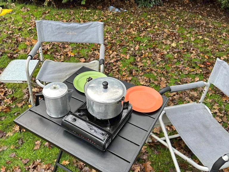 Pot, pan, coffee kettle, cooking utensils (spatula, tongs), cups, plates, eating utensilsOutdoor Setup:2 camping chairs + 1 camping table