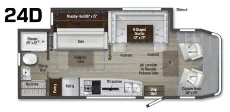 • Murphy bed + Overhead bunk + Convertible dinette – sleeps 6 (4 seat belts)