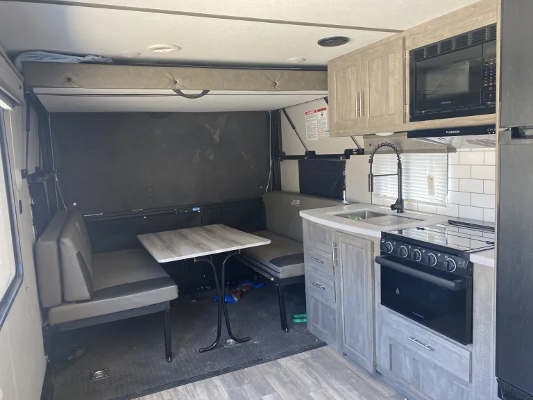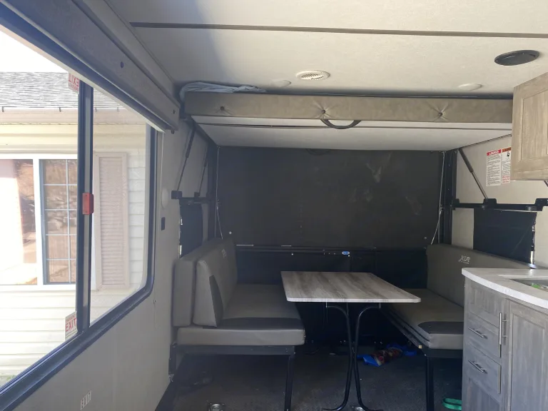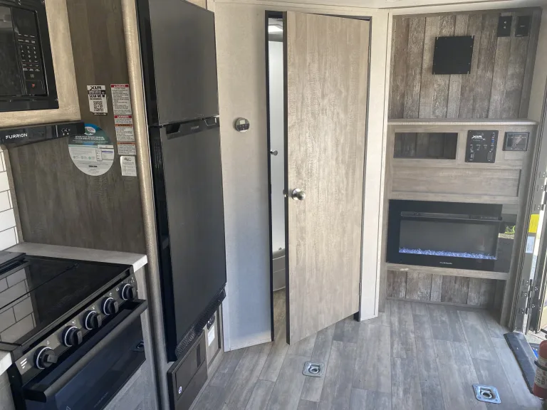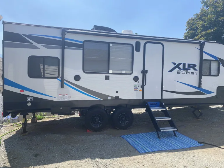 Deck on Wheels,We have a new 2022 25 foot toy hauler ready for some fun! We absolutely love camping with our family and we want to offer the camp life to yours as well!It comes with an over sized window, full sized fridge, and enough room to fit 4 full size dirt bikes. Once you have all your toys out of the trailer you can set up the huge deck to enjoy dinners on the patio, or to play some board games!The trailer has one private bedroom with a walk around queen. Other beds are in the back set up as bunk beds, queen size. Make memories with the whole fam jam including your furry friends.Ce qui est inclusYou will be set up with:Keurig