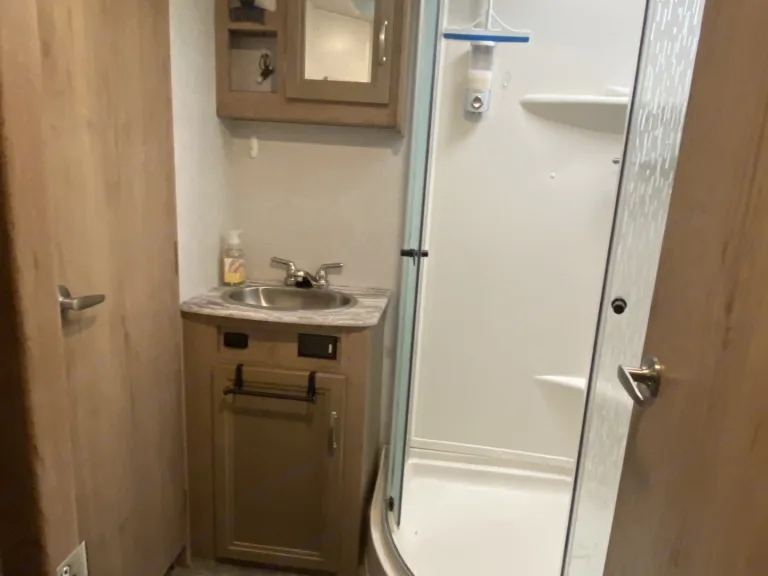 Escape in style a travel trailer that combines comfort, functionality, The slide provides an open concept feeling. Small enough to park in campgrounds. This Trailer sleeps 6. Private Master with Queen Size Bed with standard door for privacy. The Master has small closet on side and USB charger. Large Closet space. Dinette and sofa couch fold into beds as well, both could sleep two people. Full Bathroom with doors from either the master bath or main living area.