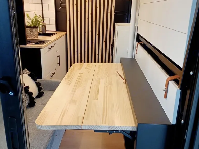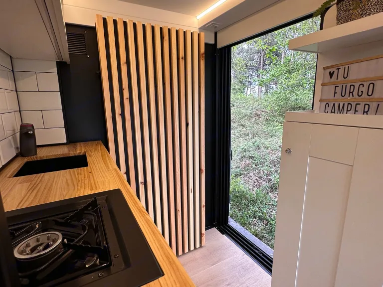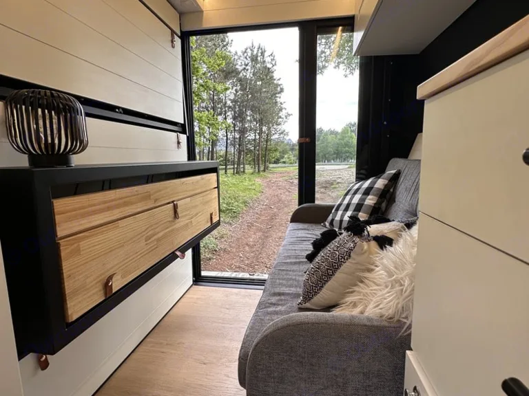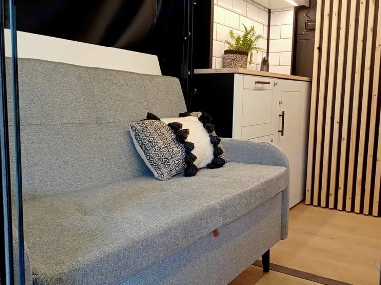 A cozy queen bed and essential kitchen gear simplify your road trip.