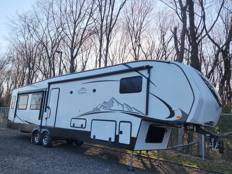 This East to West Tandara 385mb is the Ultimate 42 foot Glamper Camper. The middle bunkhouse gives you a space to utilize as a living area with a hide-a-bed sofa, an office with a desk, and a bedroom with a fold-down bunk and closet. The loft above can be accessed using the loft ladder in the hallway and creates a space to sleep or store items up and away. The master suite has a walk-around king bed slide out with storage underneath and easy access to the full bathroom with a seamless fiberglass shower. The residential microwave and refrigerator allow you to cook like at home, and the kitchen island provides a deep seated stainless steel sink and residential high rise faucet with pull-down sprayer making cleaning the dishes super easy. You can relax on the hide-a-bed sofa or theater seating and dine at the wall-mounted free standing table with four chairs. And don't forget about the two power awnings offering a nice living space outside protected from the elements. So book the Mobile Beach House for the 2023 Camping Season and enjoy what luxury camping has to offer!We only offer delivery, you are unable to tow on your own.Ce qui est inclusKitchen
