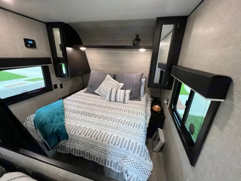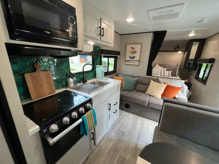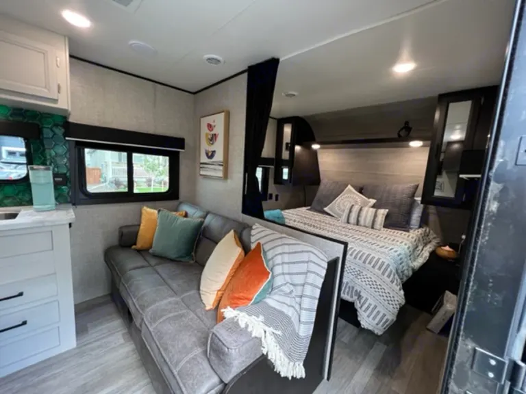 brand new off the lot as of late July 2022. It was already a great camper, but we've added some upgrades to make it an even more comfortable and fun space. Plush bedding, a 4 inch memory foam mattress topper on the main bed, throw blankets & pillows, and extra soft bath towels will help you achieve the highest level of relaxation possible during your stay. In the morning, enjoy a hot cup of coffee with the included Keurig machine (please bring your preferred pods), while sitting outside under Super Spud's power awning.