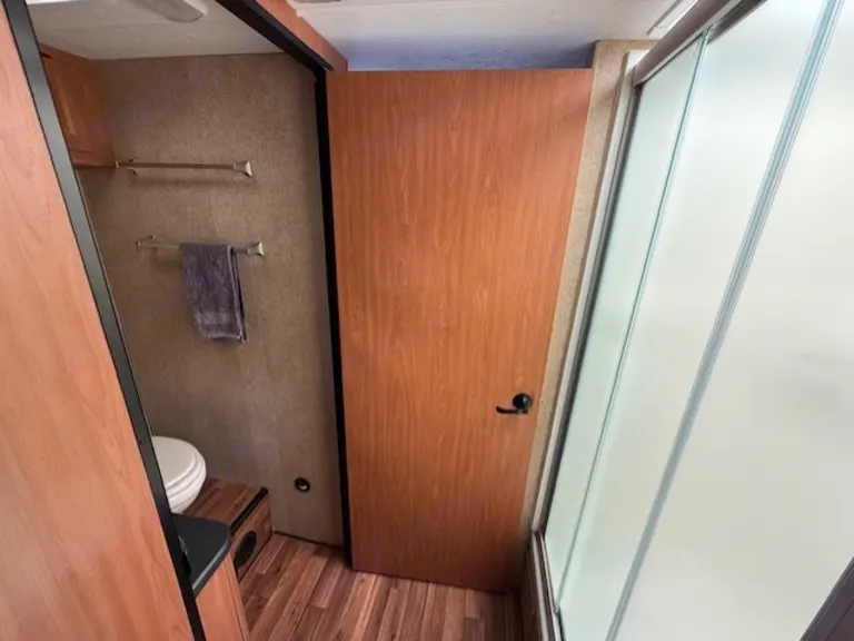 The kitchen features a 3-burner cooktop, microwave, coffee maker (w/6 pods) and a refrigerator/freezer combo. You will also find dishes, silverware, cookware, and the basic peripherals needed for making it easy to prepare meals on the road. With ample counter space and overhead cabinets for storage, you can enjoy home-cooked meals no matter where you are. This setup is perfect for those who want to cut down on dining expenses and enjoy the convenience of cooking while traveling.Stocked Bathroom: