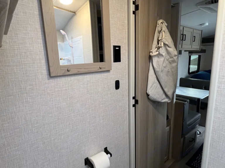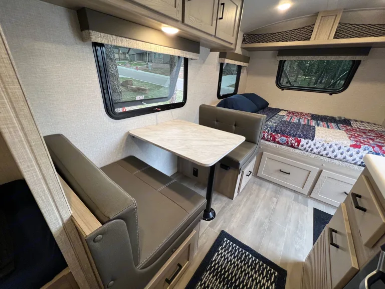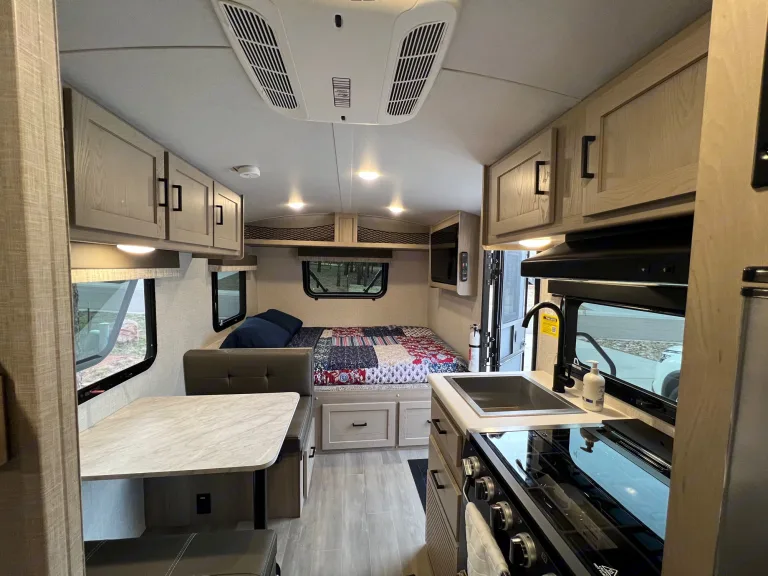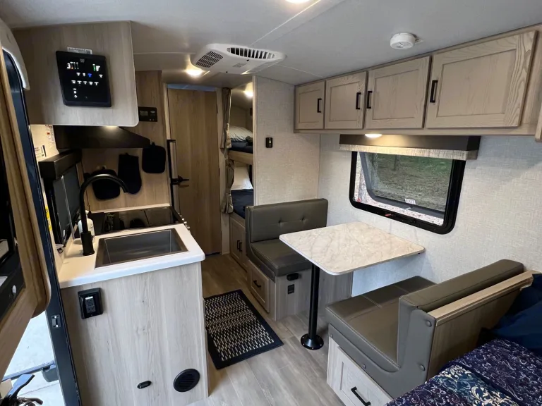 Family friendly travel trailer, compact and light enough but still comfortable for those on the road trips! This camper is equipped with solar and inverter so you can enjoy those moments in the middle of nature with no hook-ups. It also has an extra plug for an extra satellite if you will be off the grid for longer than a few days. There is a bathroom, bunk beds, eating area to include an outdoor detachable grill for those outdoor bbq’s. There is a outdoor shower attachment to do a rinse off if needed. Tv is included in the camper for movie nights and when your winding down from your long tiring adventures. The bathroom has a small tub inside if small kiddos Demand their bath.