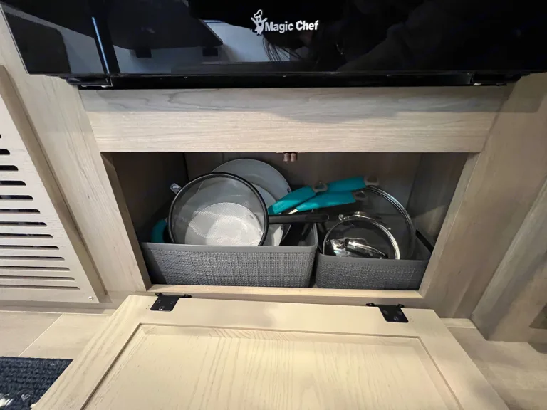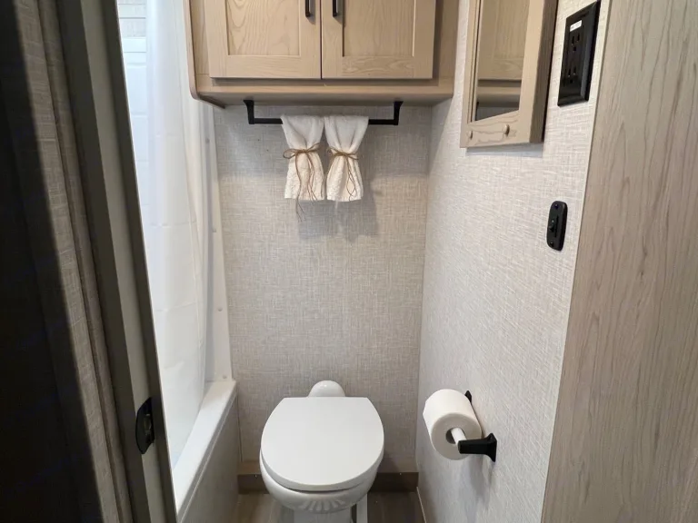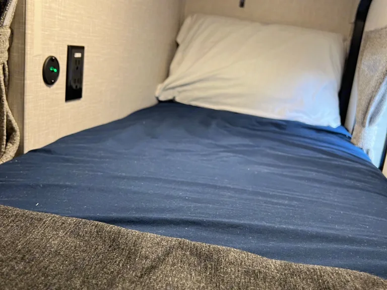 4 towels are provided with hand towels and wash cloths. A laundry hamper is provided in the camper for the used towels.