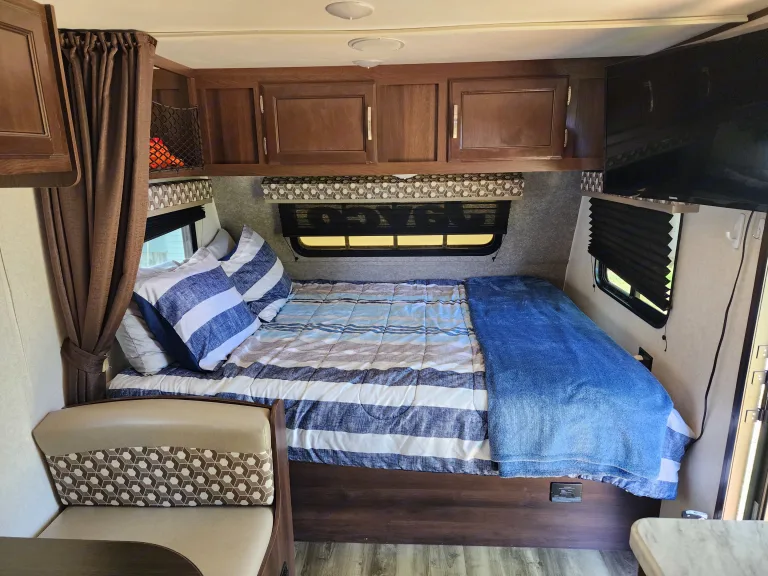 Great budget camper with all the comforts. Sleeps 4. 21 feet long. Has pantry, radio with speakers in awning. Comes with outside folding table. Folding chair for two. Tabletop Grill. Ground rug for under awning. Also rug inside front door, runner rug in living space, thick kitchen rugs, and bathroom rug. Trash can is under kitchen counter . Kitchen comes with all needed plates, cups, utensils l, pots, pans, and serving utensils. We also offer add ons and experience camping packages. Just let us know what we can do to make your camping experience better. We're here for all you need!Ce qui est inclusFresh Linens, blankets, pillows, kitchen towels, washcloth, utensils, pot holders, pots and pans, serving utensils, plastic plates that have to be washed. Coffee pot, coffee cups, toaster, electric fry pan so meat cooking can be done outside, also table top grill, extension cord, tiki torches, freshwater hose, One small kennel, one large kennel with bedding.Autres points à signalerNO SMOKING in camper. This will cause you to loose your deposit. Small dogs only. Let us know if you need a kennel rental for when away from camper. Don't access roof. Wind and rain is not an awnings friend. Please retract awning whenever you leave camper unintended. Do not repair camper yourself. Call us for any mishaps. Keep camper clean and please keep any water dried up. Leave wet linens in shower. If you are using the fresh water tank you only have 50 gallons. Use it sparingly with the shower head feature to turn water off and on while rinsing. The propane tank will be full, but if you need more, you must provide it yourself. I provide enough linens for how many the camper sleeps, but always recommend bringing some towels so you have extra. 2-day minimum on local rentals, 3 day on over 40 miles, delivery only. If you need generators they are one for $50 a day and 2 for $75 a day. They come with gallons of gas each and that lasts around 12 hours. We provide a gas can for you to get more gas beyond that please try to use non-ethanol gas if possible.